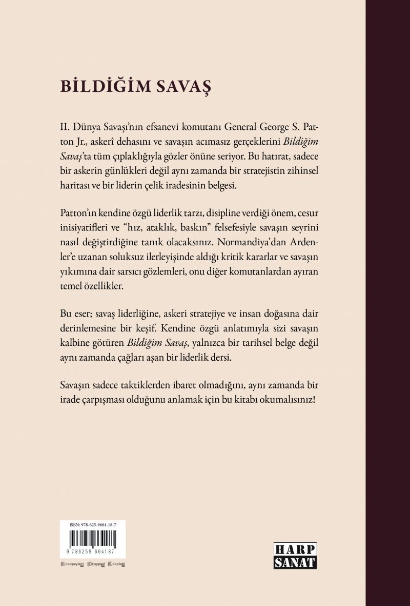 II. Dünya Savaşı'nın efsanevi komutanı General George S. Patton Jr., askeri dehasını ve savaşın acımasız gerçeklerini Bildiğim Savaş'ta tüm çıplaklığıyla gözler önüne seriyor. Bu hatırat, sadece bir askerin günlükleri değil, aynı zamanda bir stratejistin zihinsel haritası ve bir liderin çelik iradesinin belgesi.