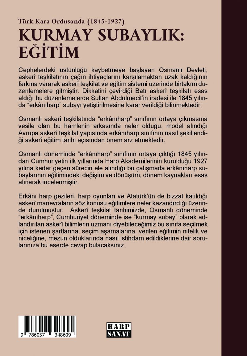 Cephelerdeki üstünlüğü kaybetmeye başlayan Osmanlı Devleti, askerî teşkilatının çağın ihtiyaçlarını karşılamaktan uzak kaldığının farkına vararak askerî teşkilat ve eğitim sistemi üzerinde birtakım düzenlemelere gitmiştir. Batı askerî teşkilatını esas aldığı bu düzenlemelerde Sultan Abdülmecit'in iradesi ile 1845 yılında "erkânıharp" subayı yetiştirilmesine karar verildiği bilinmektedir. Osmanlı askerî teşkilatında "erkânıharp" sınıfının ortaya çıkmasına vesile olan bu hamlenin arkasında neler olduğu, model alınan Avrupa askerî teşkilat yapısında erkânıharp sınıfının nasıl şekillendiği askerî eğitim tarihi açısından önem arz etmektedir. Osmanlı Dönemi'nde "erkânıharp" sınıfının ortaya çıktığı 1845 yılından Cumhuriyet Dönemi'nde Harp Akademilerinin kurulduğu 1927 yılına kadar geçen sürecin ele alındığı bu çalışmada erkânıharp subaylarının eğitimindeki değişim ve dönüşüm, dönem kaynakları esas alınarak incelenmiştir. Erkânıharp gezileri, harp oyunları ve Atatürk'ün de bizzat katıldığı askerî manevraların söz konusu eğitimlere neler kazandırdığı üzerinde durulmuştur. Askerî teşkilat tarihimizde, Osmanlı döneminde "erkânıharp", Cumhuriyet döneminde ise "kurmay subay" olarak adlandırılan askerî bilimlerin uzmanı diyebileceğimiz bu sınıfa seçilme şartlarına, seçim aşamalarına, verilen eğitimin nitelik ve niceliğine, mezunlarının nasıl istihdam edildiklerine dair sorularınıza bu eserde cevap bulacaksınız.