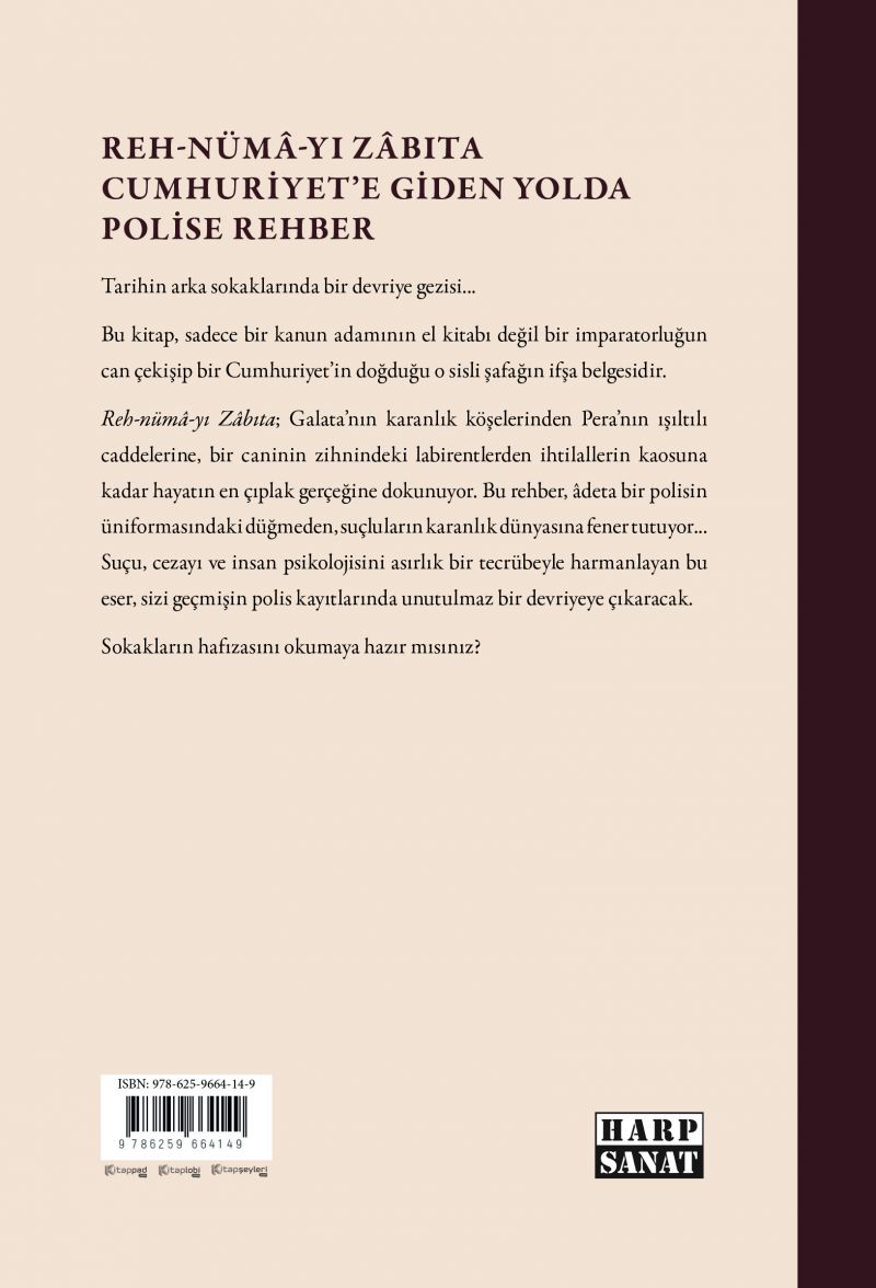 Reh-nümâ-yı Zâbıta; Galata’nın karanlık köşelerinden Pera’nın ışıltılı caddelerine, bir caninin zihnindeki labirentlerden ihtilallerin kaosuna kadar hayatın en çıplak gerçeğine dokunuyor. Bu rehber, âdeta bir polisin üniformasındaki düğmeden, suçluların karanlık dünyasına fener tutuyor... Suçu, cezayı ve insan psikolojisini asırlık bir tecrübeyle harmanlayan bu eser, sizi geçmişin polis kayıtlarında unutulmaz bir devriyeye çıkaracak.