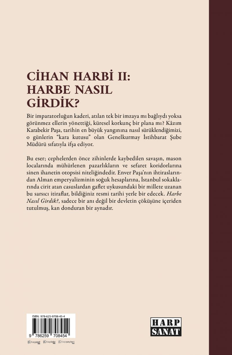 Bu eser; cephelerden önce zihinlerde kaybedilen savaşın, mason localarında mühürlenen pazarlıkların ve sefaret koridorlarına sinen ihanetin otopsisi niteliğindedir. Enver Paşa’nın ihtiraslarından Alman emperyalizminin soğuk hesaplarına, İstanbul sokaklarında cirit atan casuslardan gaflet uykusundaki bir millete uzanan bu sarsıcı itiraflar, bildiğiniz resmi tarihi yerle bir edecek. Harbe Nasıl Girdik?, sadece bir anı değil bir devletin çöküşüne içeriden tutulmuş, kan donduran bir aynadır.