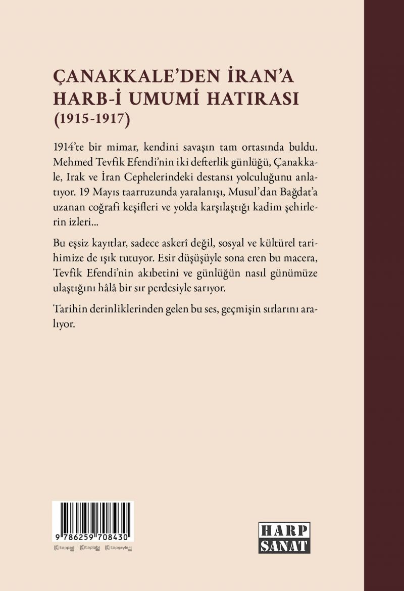1914'te bir mimar, kendini savaşın tam ortasında buldu. Mehmed Tevfik Efendi'nin iki defterlik günlüğü, Çanakkale, Irak ve İran cephelerindeki destansı yolculuğunu anlatıyor. 19 Mayıs taarruzunda yaralanışı, Musul'dan Bağdat'a uzanan coğrafi keşifleri ve yolda karşılaştığı kadim şehirlerin izleri...